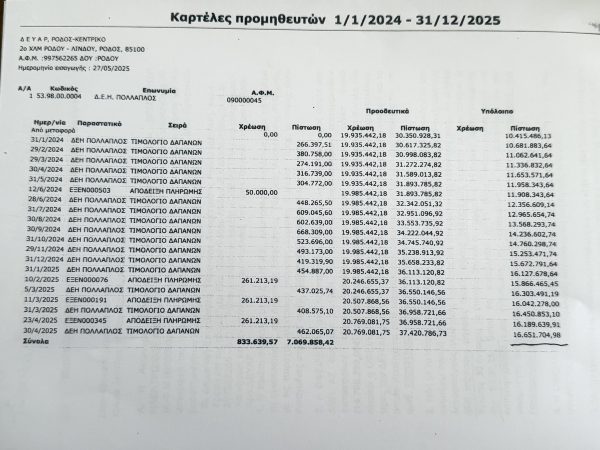 Η εικόνα τον Απρίλιο του 2025: Το υπόλοιπο προς τη ΔΕΗ ανερχόταν ήδη στα 16.651.704,98 ευρώ ευρώ.