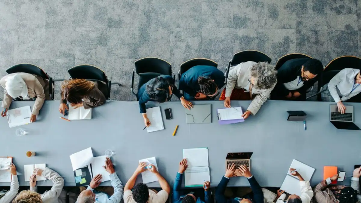 Top view of diverse business group in office meeting, collaborating and discussing around a large table.