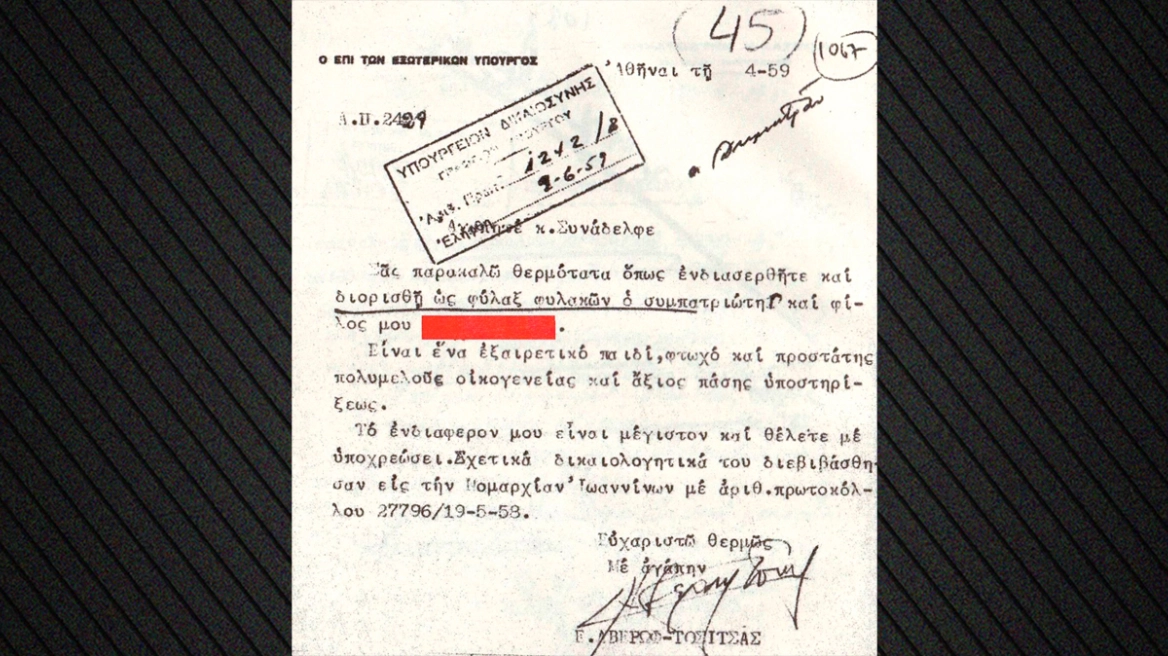 Ο Επί των Εξωτερικών υπουργός Ευάγγελος Αβέρωφ-Τοσίτσας, το 1959, ενδιαφέρεται για τον διορισμό, ως φύλακα σε φυλακή, ενός… εξαιρετικού παιδιού, φτωχού και προστάτη πολυμελούς οικογενείας
