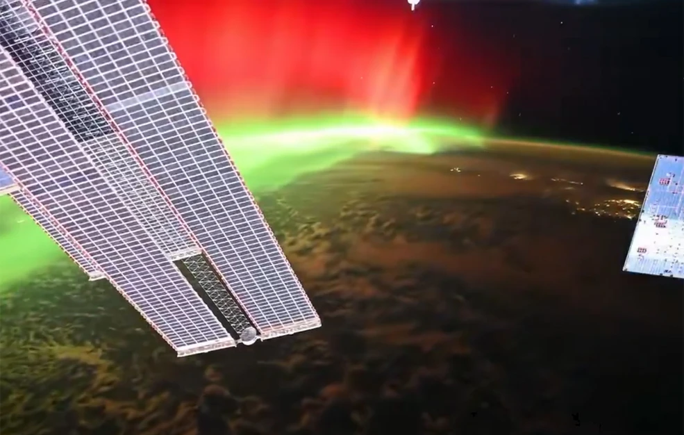 Στο βίντεο που δημοσίευσε, διακρίνεται ένα πράσινο και κόκκινο πέπλο φωτός να «ακουμπά» τις βόρειες περιοχές της Γης, δημιουργώντας ένα μοναδικό οπτικό θέαμα.