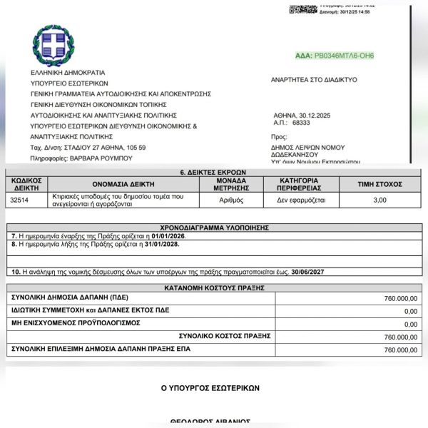 Υπεγράφηκε και αναρτήθηκε στη Διαύγεια η απόφαση χρηματοδότησης του Δήμου Λειψών ύψους 760.000 € για την αγορά και ανέγερση κατοικιών δημοσίων υπαλλήλων, από τον Υπουργό Εσωτερικών Θεόδωρο Λιβάνιο