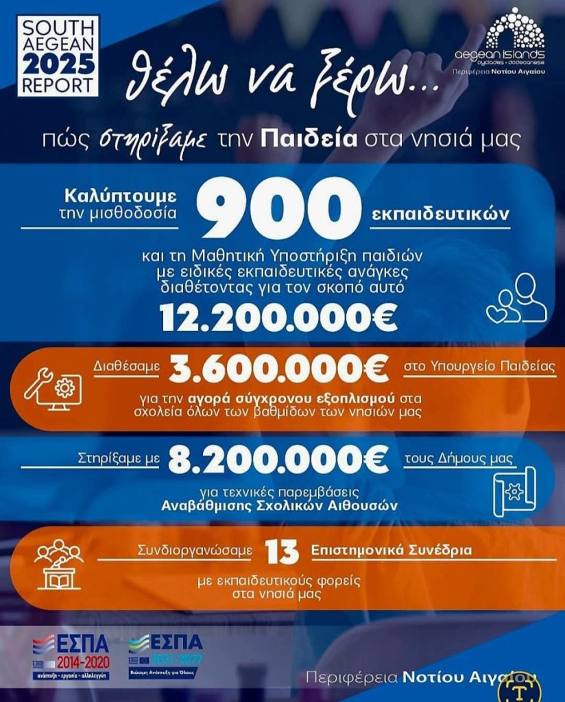 Είμαστε περήφανοι που καταφέραμε να καλύψουμε την μισθοδοσία 900 εκπαιδευτικών που υπηρετούν στα νησιά μας, δίνοντας έμφαση στη στήριξη παιδιών με ειδικές εκπαιδευτικές ανάγκες. Γιατί, κανένα παιδί μας δεν πρέπει να μένει πίσω.
