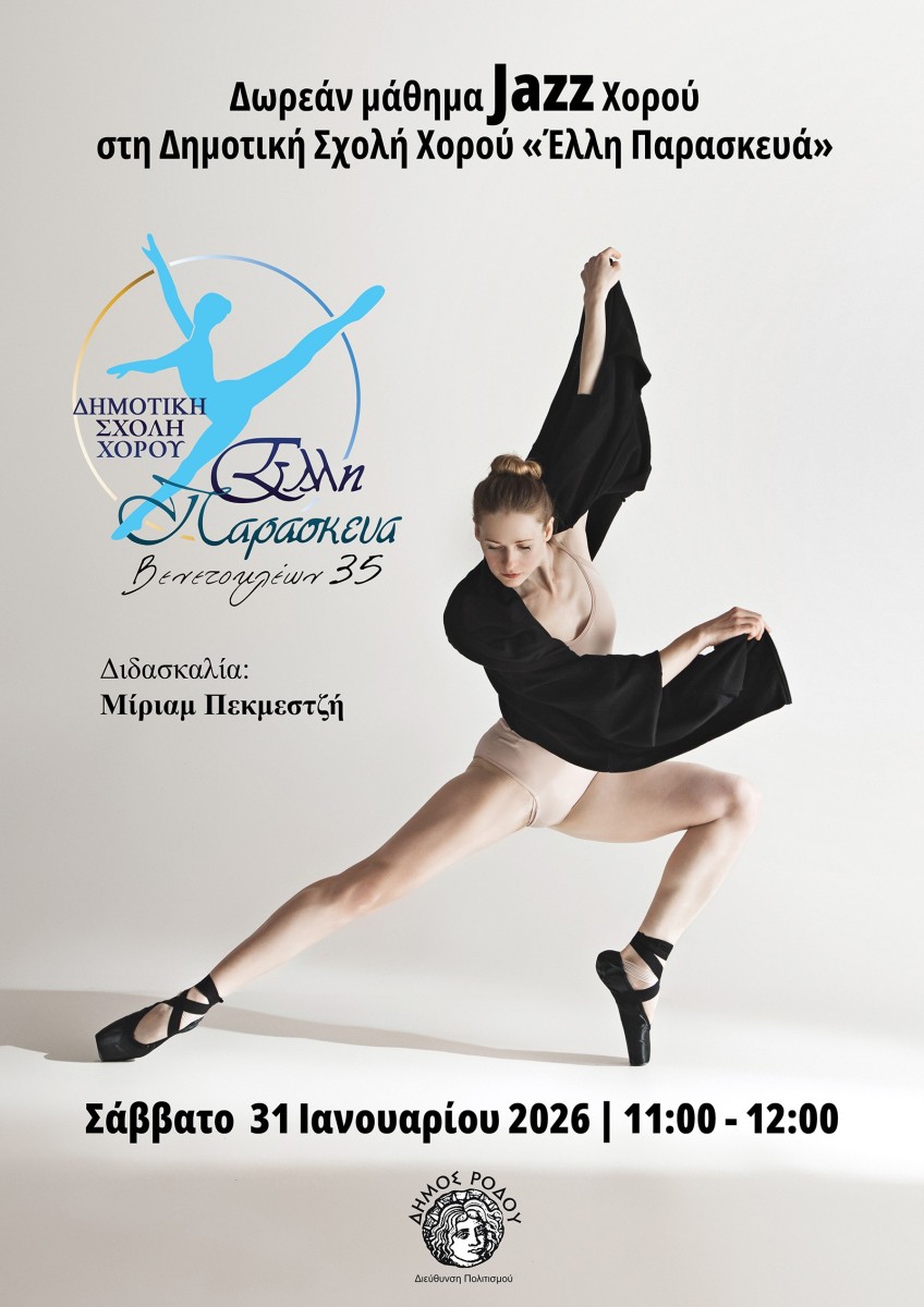 11.00 -12.00 π.μ., θα πραγματοποιηθεί δωρεάν μάθημα Jazz Χορού στη Δημοτική Σχολή