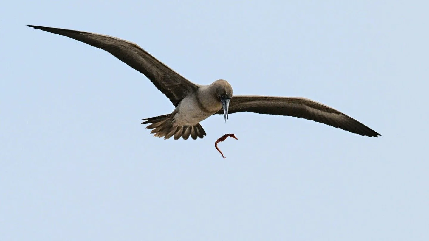 «Ένα νεαρό red-footed booby (μεγάλο θαλασσοπούλι) πετούσε από επάνω μου», συνεχίζει, «κρατώντας αδέξια κάτι στο ράμφος του και πετώντας το στον αέρα. Από περιέργεια, το ακολούθησα μέσα από το σκόπευτρο της μηχανής μου. Μετά από μερικά καρέ, κατάλαβα με τι “πάλευε”: έναν ιππόκαμπο» αποκαλύπτει.