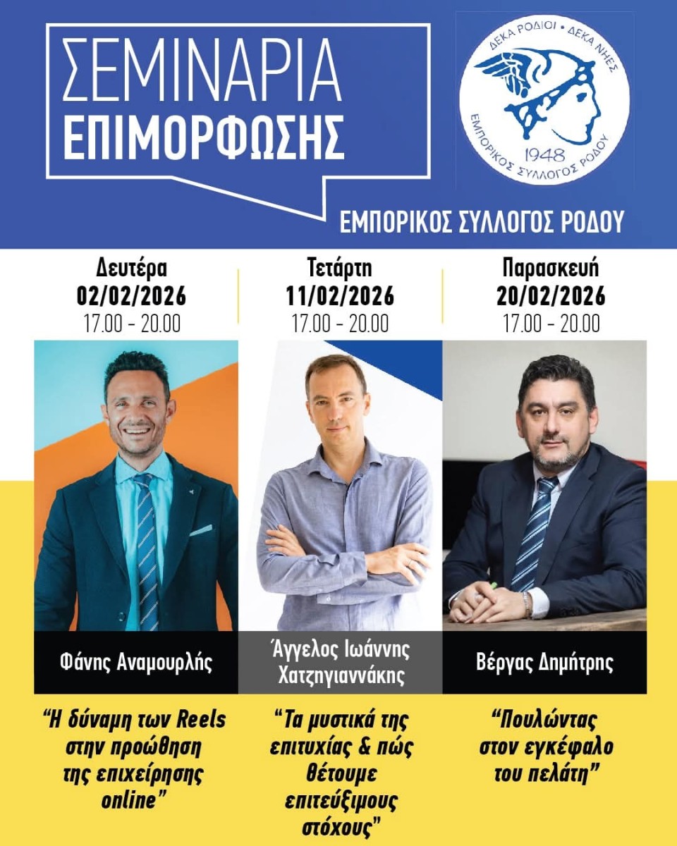 Ο Εμπορικός Σύλλογος Ρόδου σας καλεί σε 3 μοναδικά ΔΩΡΕΑΝ σεμινάρια που θα αλλάξουν τον τρόπο που σκέφτεστε για την επιχείρησή σας!