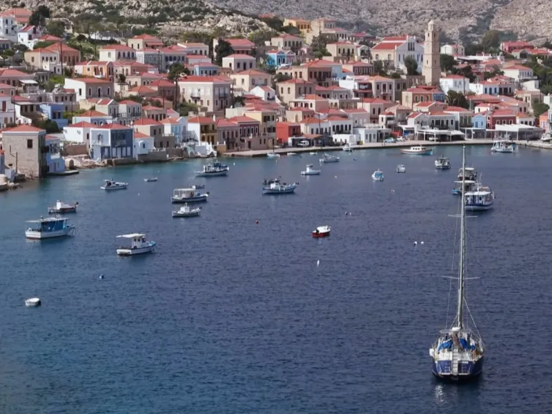 Λίγα μίλια μακριά, η Σύμη μοιάζει με ζωγραφιά. Ο διατηρητέος οικισμός, που έχει αναγνωριστεί στο σύνολό του ως αρχαιολογικός χώρος από το Κεντρικό Αρχαιολογικό Συμβούλιο, φιλοξενεί 159 χώρους και μνημεία που αποτυπώνουν τη μακραίωνη ιστορία του, με ρίζες στην προϊστορική εποχή. Η αρχιτεκτονική του νησιού είναι μοναδική στα Δωδεκάνησα με τα νεοκλασικά αρχοντικά, βαμμένα σε αποχρώσεις της ώχρας, του κεραμιδί και του γαλάζιου, να σκαρφαλώνουν αμφιθεατρικά πάνω από το λιμάνι, δημιουργώντας ένα εντυπωσιακό σκηνικό.