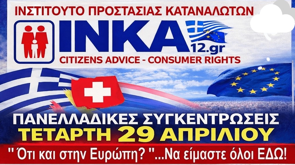 Το Ινστιτούτο Καταναλωτών ΙΝΚΑ12 καλεί όλους τους δανειολήπτες και τους πολίτες της Ρόδου σε μαζική και δυναμική συμμετοχή στη συγκέντρωση διαμαρτυρίας που θα πραγματοποιηθεί: