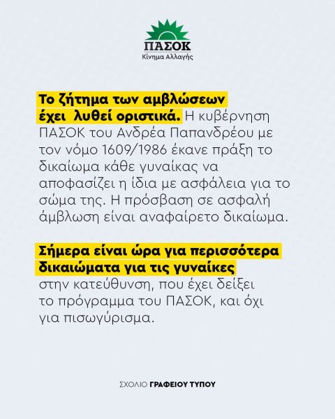 Το ζήτημα των αμβλώσεων έχει λυθεί οριστικά. Η κυβέρνηση ΠΑΣΟΚ του Ανδρέα Παπανδρέου με τον νόμο 1609/1986 έκανε πράξη το δικαίωμα κάθε γυναίκας να αποφασίζει η ίδια με ασφάλεια για το σώμα της. Η πρόσβαση σε ασφαλή άμβλωση είναι αναφαίρετο δικαίωμα.