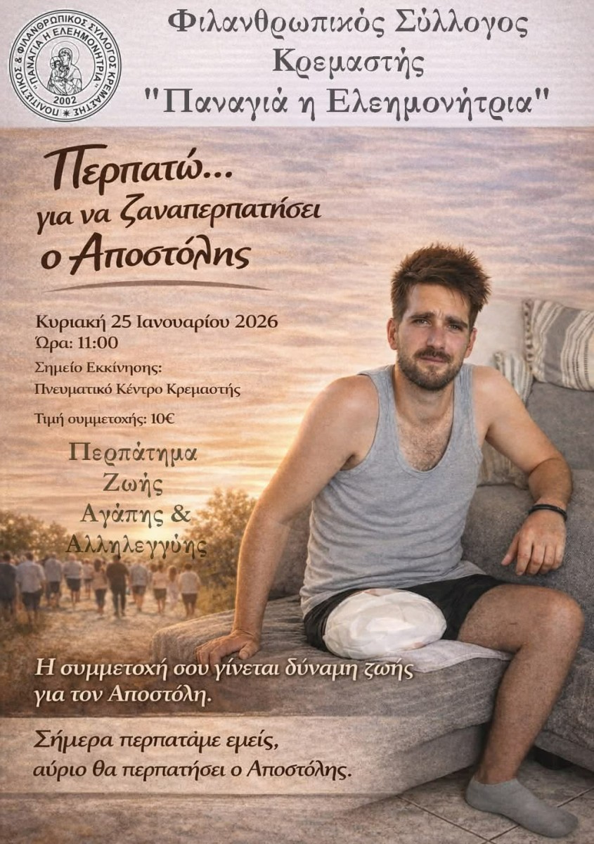 15.01.’26 – Αγαπητά μέλη, φίλες και φίλοι του Φιλανθρωπικού Συλλόγου Κρεμαστής ”Παναγιά η Ελεημονήτρια”, σας υπενθυμίζουμε ότι ο Σύλλογός μας βρίσκεται δίπλα στον Αποστόλη Στρογγυλό, ηθικά και οικονομικά, όπως γνωρίζετε, από τον Μάιο του 2025, αμέσως μετά τον ακρωτηριασμό του δεξιού του ποδιού, ο οποίος προήλθε μετά από σοβαρό τροχαίο ατύχημα.