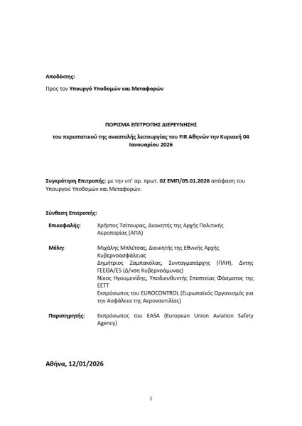 Υποβλήθηκε, σήμερα, στον Υπουργό Υποδομών και Μεταφορών Χρίστο Δήμα, το πόρισμα της Επιτροπής Διερεύνησης του περιστατικού αναστολής λειτουργίας του FIR Αθηνών την Κυριακή 4 Ιανουαρίου 2026, η οποία συγκροτήθηκε με απόφαση του Υπουργού, με σκοπό να αποσαφηνιστούν τα ακριβή αίτια του προβλήματος που παρουσιάστηκε σε συχνότητες του FIR Αθηνών.
