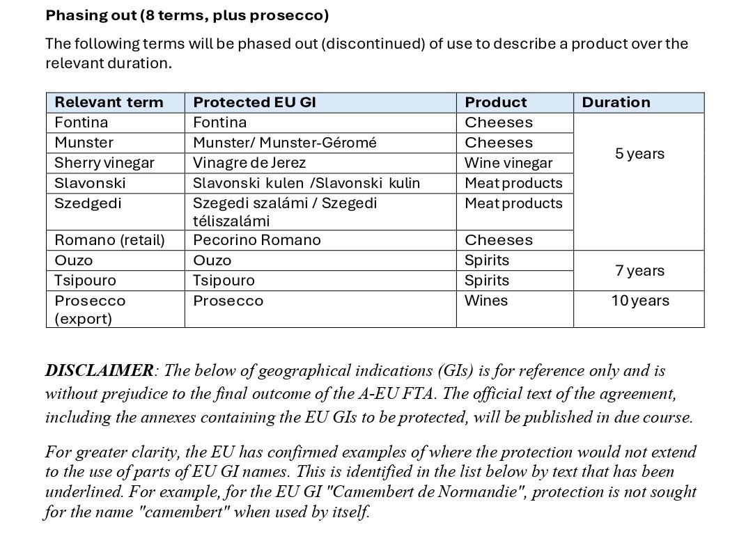 «Η Αυστραλία θα προστατεύσει και τις 396 γεωγραφικές ενδείξεις που ζήτησε η ΕΕ, οι περισσότερες από τις οποίες δεν διαπιστώθηκε ότι χρησιμοποιούνται από Αυστραλούς παραγωγούς και, ως εκ τούτου, η προστασία τους είναι απίθανο να έχει σημαντικό εμπορικό αντίκτυπο στην Αυστραλία. Ορισμένοι όροι που έχουν χαρακτηριστεί ως εμπορικά πολύτιμοι για τους Αυστραλούς παραγωγούς θα προστατεύονται με ευελιξία» αναφέρει το υπουργείο Εξωτερικών Υποθέσεων και Εμπορίου της Αυστραλίας.
