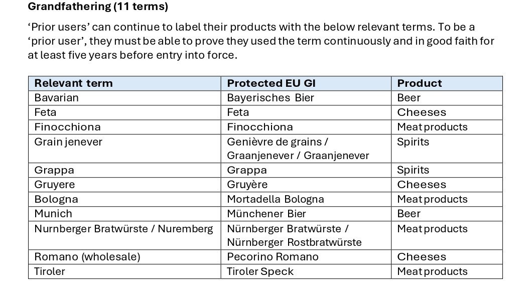 «Οι “προηγούμενοι χρήστες” μπορούν να συνεχίσουν να επισημαίνουν τα προϊόντα τους με τους παρακάτω σχετικούς όρους. Για να είναι «προηγούμενος χρήστης», πρέπει να είναι σε θέση να αποδείξουν ότι χρησιμοποίησαν τον όρο συνεχώς και καλή τη πίστει για τουλάχιστον πέντε έτη πριν από την έναρξη ισχύος» της συμφωνίας εξηγεί η ανακοίνωση της αυστραλιανής κυβέρνησης.