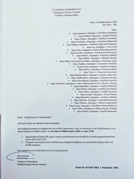 Νοτίου Αιγαίου, με αντικείμενο τη συμμετοχή τους σε τηλεδιάσκεψη που θα πραγματοποιηθεί τη